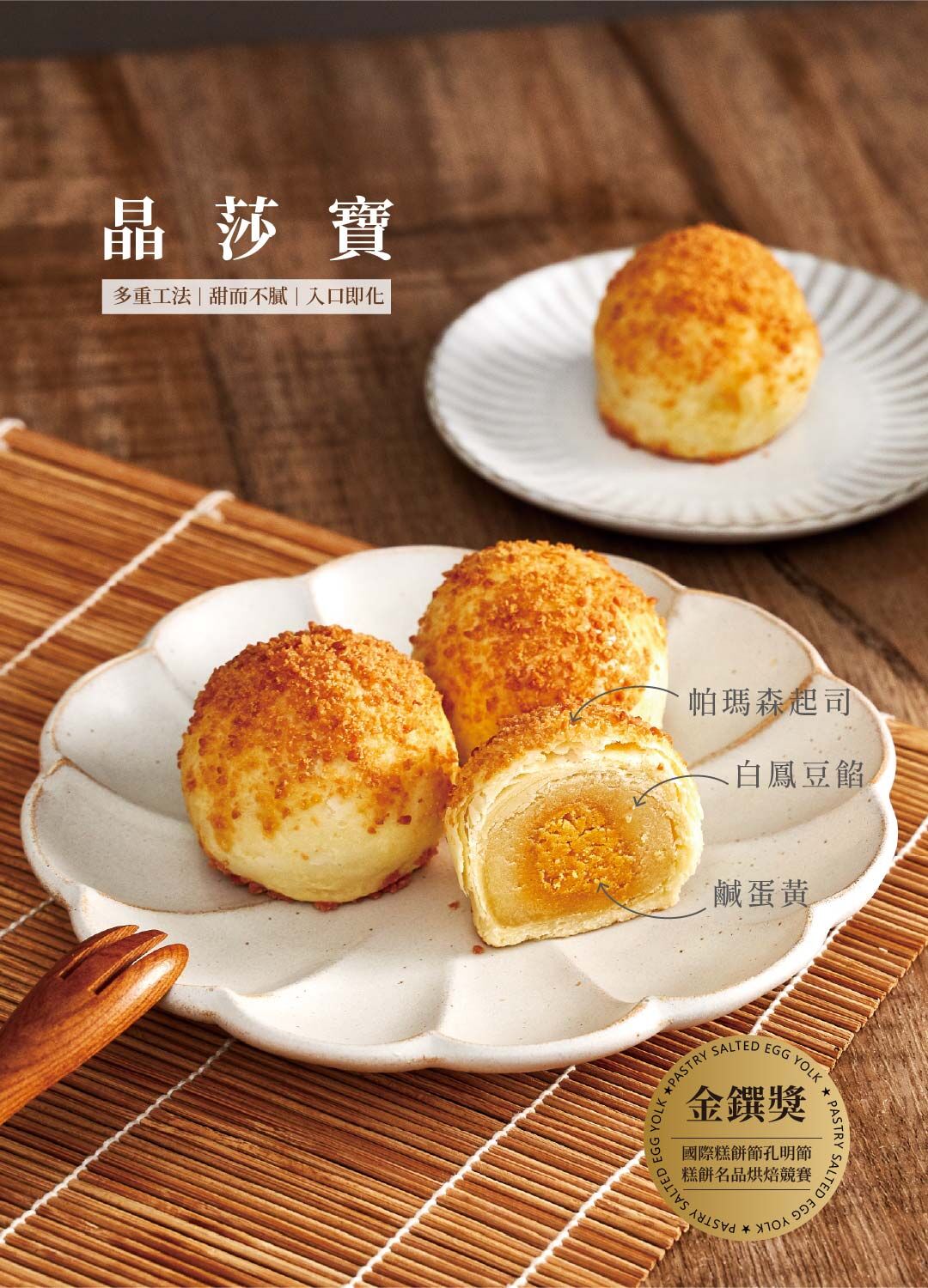 商品成分:麵粉、安佳奶油、晶莎餡(白鳳豆、蔗糖、綠豆仁、奶油、蛋黃液、奶粉、鹽)、砂糖、鹹蛋黃(鴨蛋、鹽)、起司粉、蛋。