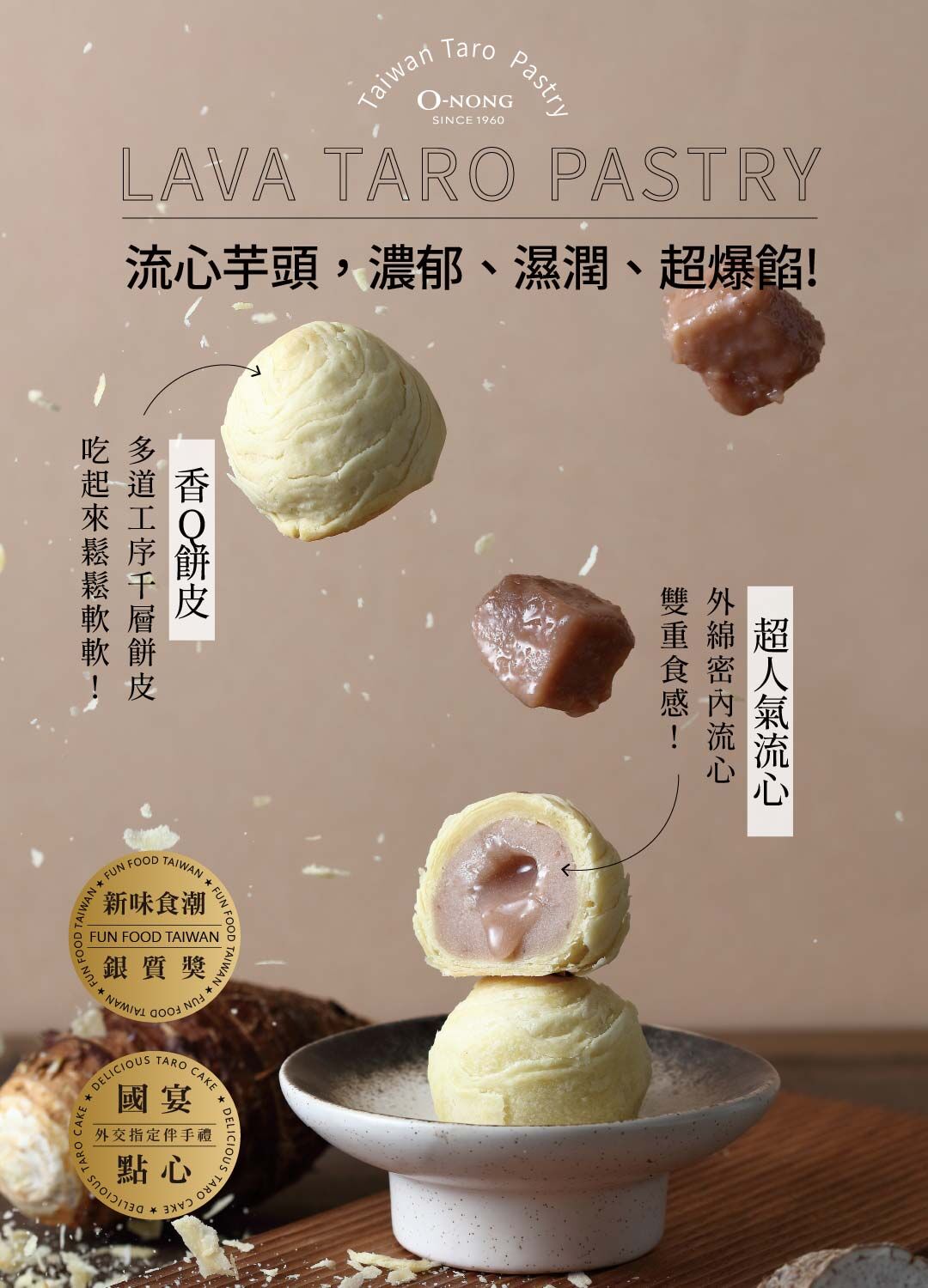 【流芋小芋仔】以上等芋頭製成,外皮酥脆,內餡醇厚如溪水般流動,芋香悠然,喚起家鄉的味道。