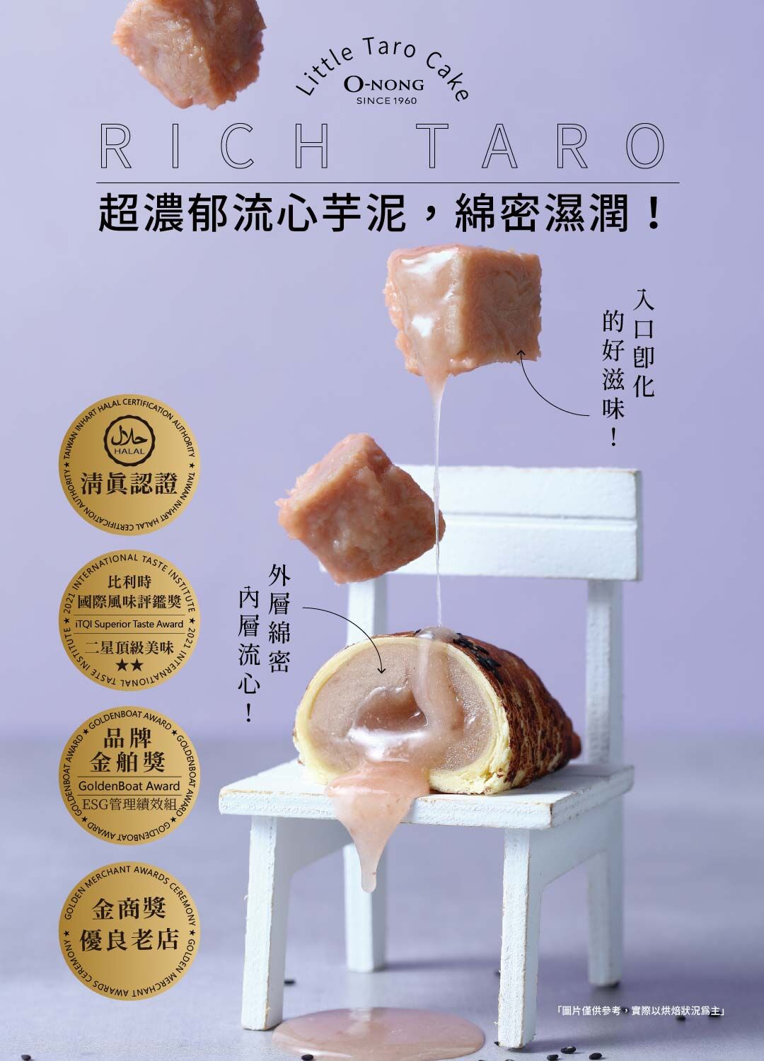 商品成分:麵粉、芋泥餡【芋頭、白鳳豆、蔗糖、麥芽糖、白油(棕櫚油)、大豆沙拉油、麥芽糊精、乳清、奶粉、黏稠劑(羥丙基磷酸二澱粉)、椰漿粉(新鮮椰漿、麥芽糊精、乾酪素鈉)、鹽、香料、糖味調味劑(香料、麥芽糊精)】、安佳奶油、砂糖、水麥芽(樹薯澱粉、水)、芋頭流芯餡﹛水、流心預拌粉【糖粉、海藻糖、羥丙基磷酸二澱粉、乙醯化己二酸二澱粉、羧甲基纖維素鈉】、麥芽糖、白鳳豆、海藻糖、芋頭粉、香料、香料粉【香料、葡萄糖、食用色素(藍色一號、紅色七號、紅色四十號)、品質改良劑(二氧化矽、葡萄糖、阿拉伯糖、麥芽糊精】﹜、可可粉。