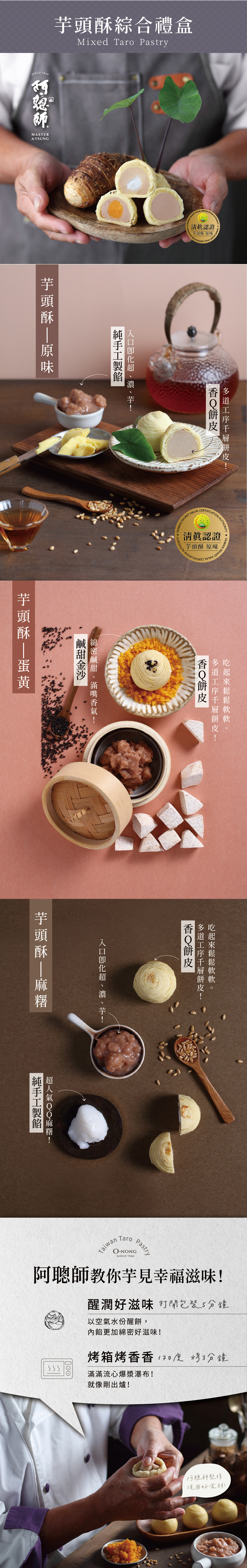 台灣芋頭酥是由台灣大甲芋頭產業推手芋頭酥之父阿聰師所發明創造,嚴選上等芋頭,在芋頭酥之父「阿聰師」的巧手下,化做一片片層次分明的玫瑰花瓣,純手工製作,新鮮烘焙。來到大甲您不得不買的大甲名產伴手禮。