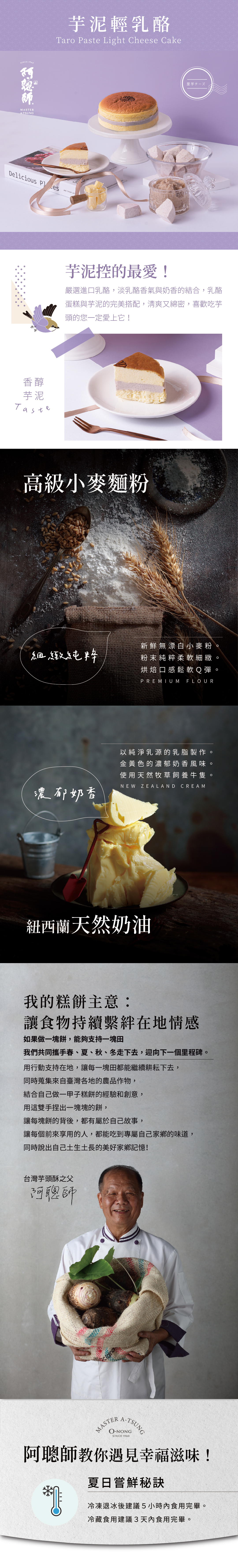 嚴選進口乳酪,淡乳酪香氣與奶香的結合,乳酪蛋糕與芋泥的完美搭配,清爽又綿密,喜歡吃芋頭的您一定愛上它!