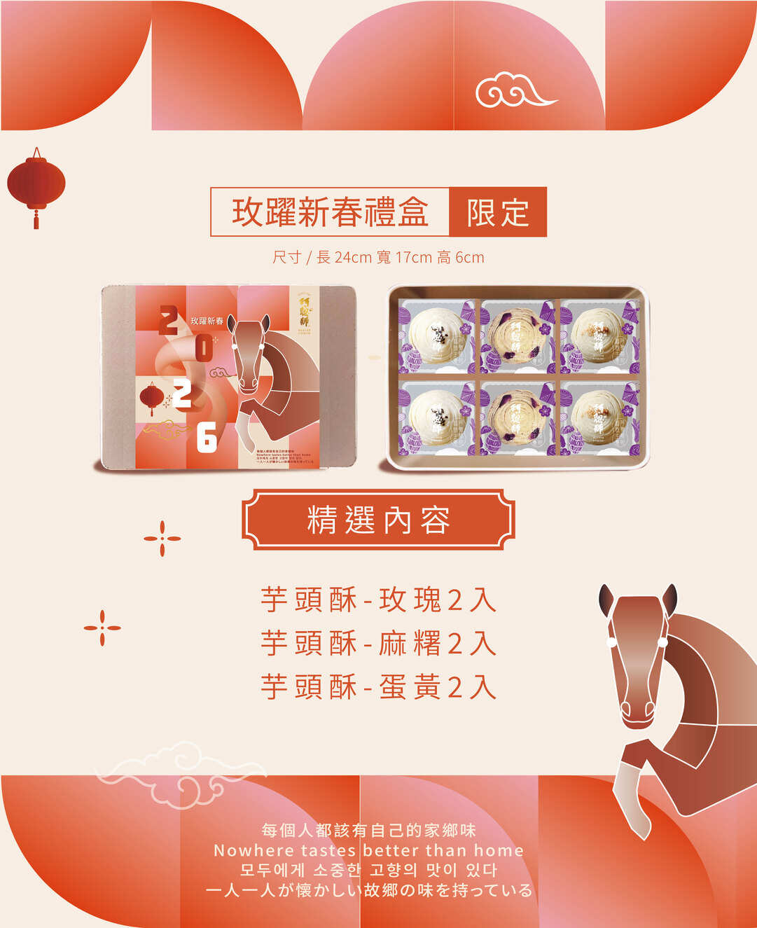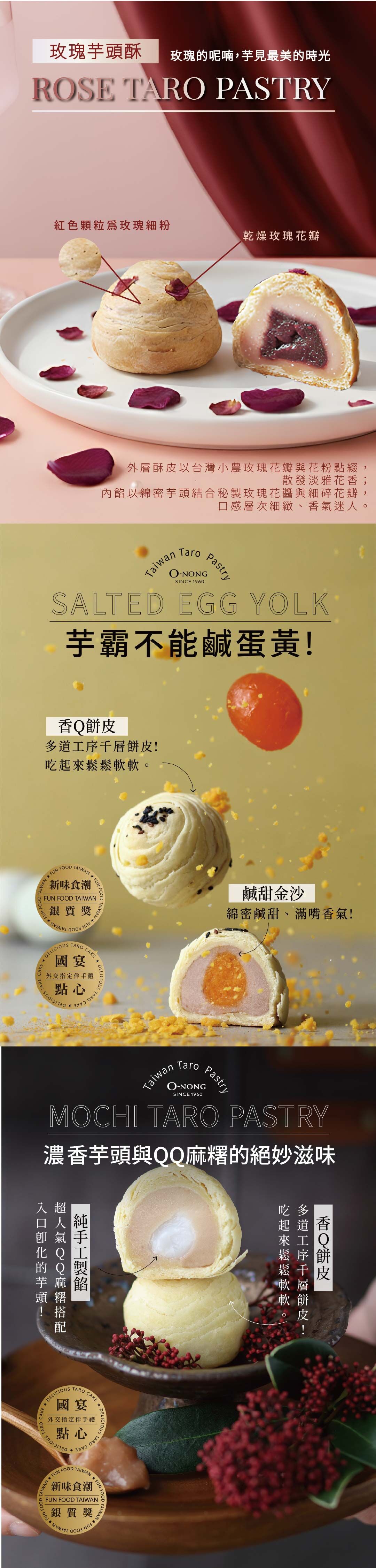 【芋頭酥-玫瑰】外層酥皮撒上台灣小農栽種玫瑰花瓣與細粉,散發淡雅花香;內餡以綿密芋泥融合秘製玫瑰花醬與碎瓣,層次細緻迷人