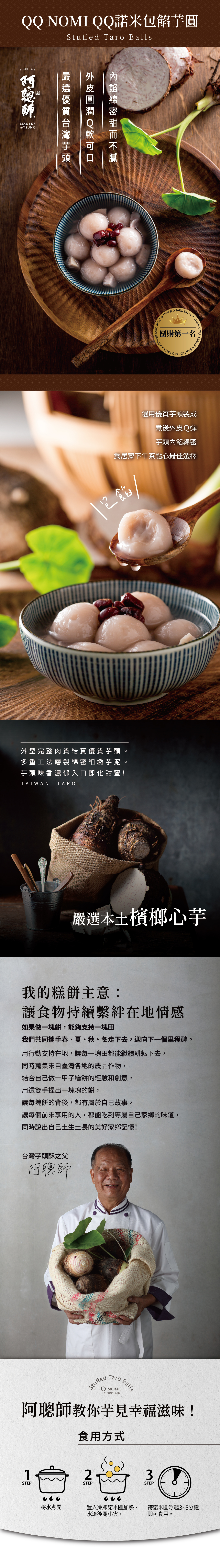 選用優質芋頭製成,煮後外皮Q彈;芋頭內餡綿密,為居家下午茶點心最佳選擇。