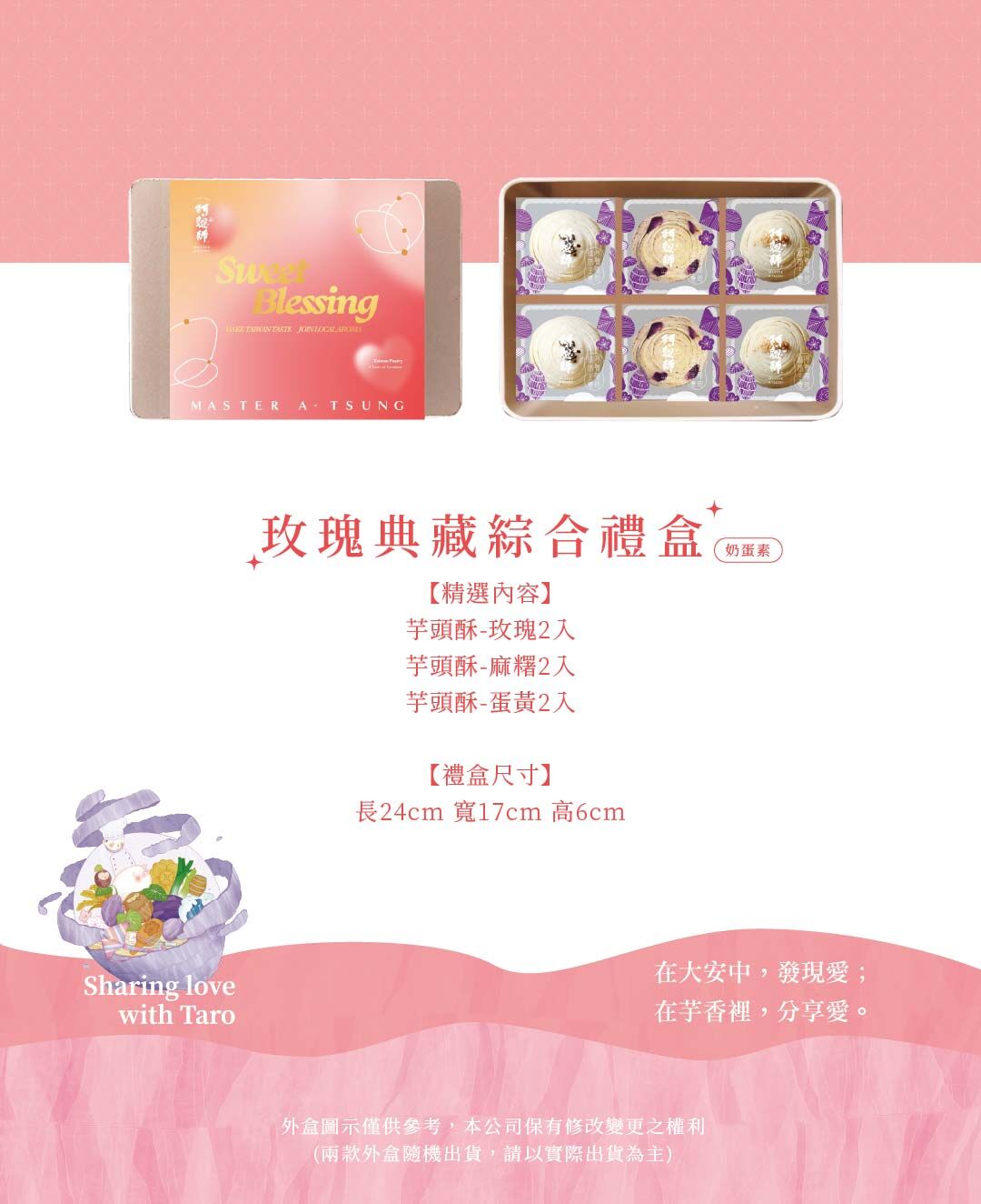 禮盒尺寸(6入):芋頭酥-玫瑰2入+芋頭酥-麻糬2入+芋頭酥-蛋黄2入