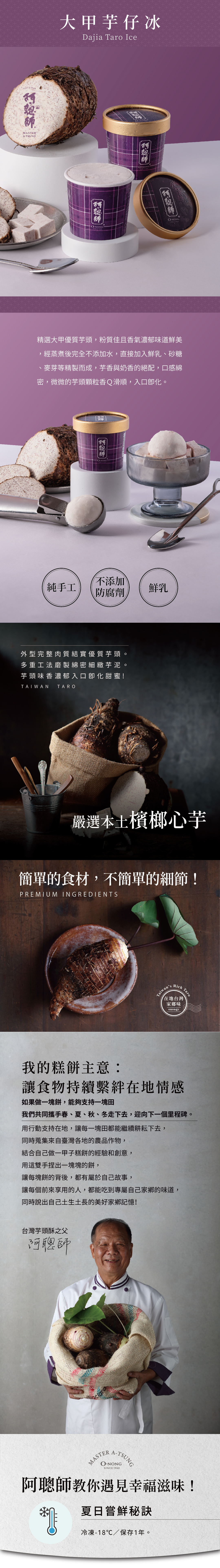 精選大甲優質芋頭,粉質佳且香氣濃郁味道鮮美,經蒸煮後完全不添加水,直接加入鮮乳、砂糖、麥芽等精製而成,芋香與奶香的絕配,口感綿密,微微的芋頭顆粒香Q滑順,入口即化。