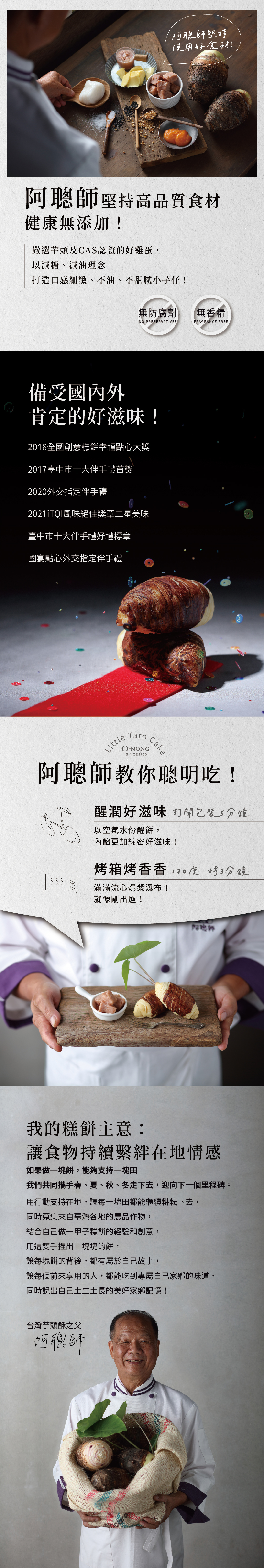 台灣芋頭酥是由台灣大甲芋頭產業推手芋頭酥之父 阿聰師所發明創造,芋頭酥之父再次推出台灣新品種【阿聰師的小芋仔】嚴選上等芋頭,以植物油製成,在芋頭酥之父「阿聰師」的巧手下,免剝皮,連皮吃,手不癢,不吃心會癢就是好吃。2019【阿聰師的小芋仔】再進化,流心內餡,紮實的四層口感,酥鬆的外皮包裹著芋綿密、麻糬Q、奶皇醇、流心餡,一口咬下香鹹濃郁的流心奶黃醬,頓時湧出美妙的滋味。