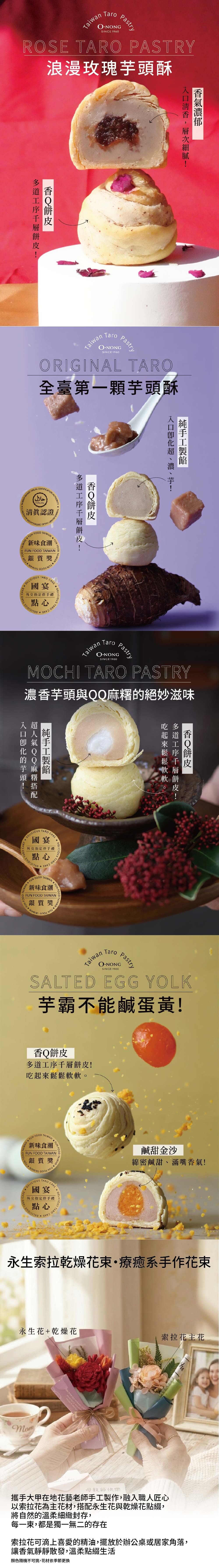 【芋頭酥-玫瑰】外層酥皮撒上台灣小農栽種玫瑰花瓣與細粉,散發淡雅花香;內餡以綿密芋泥融合秘製玫瑰花醬與碎瓣,層次細緻迷人。
