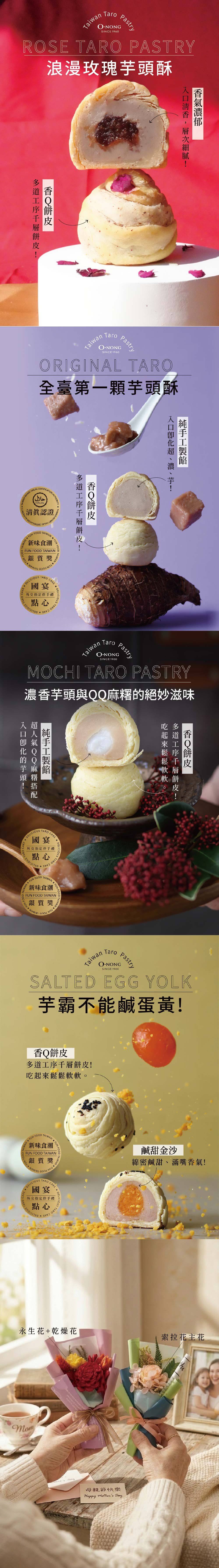【芋頭酥】台灣芋頭酥是由台灣大甲芋頭產業推手芋頭酥之父阿聰師所發明創造,嚴選上等芋頭,在芋頭酥之父「阿聰師」的巧手下,化做一片片層次分明的玫瑰花瓣。