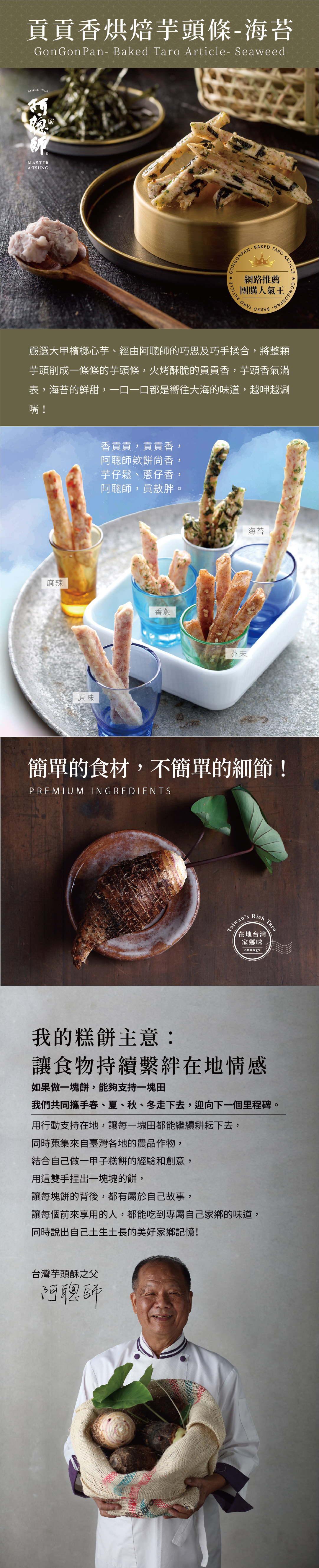 火烤酥脆的貢貢香芋頭香氣滿表,越呷越涮嘴!清甜海苔-讓你重拾青春記憶!